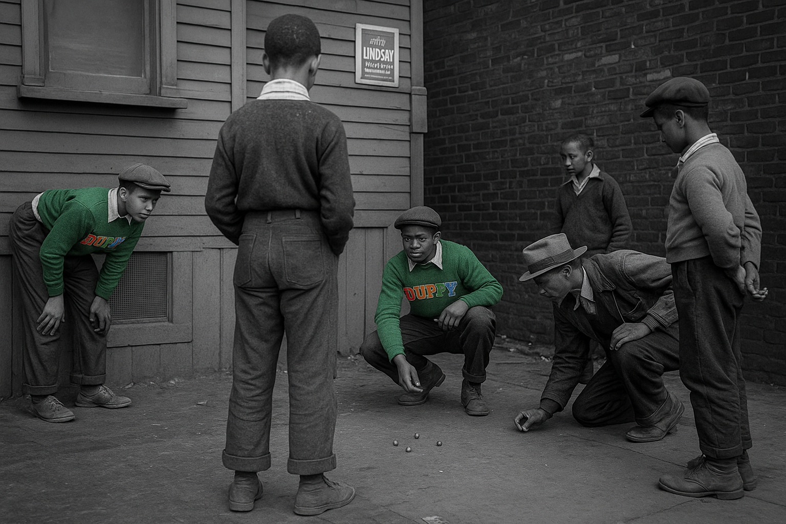 A reimagined vintage Chicago street scene where youth and style collide. DUPPY Playground captures the energy of community — boys in chenille sweaters crouched in focus, representing a generation that found joy and resilience with nothing but imagination.